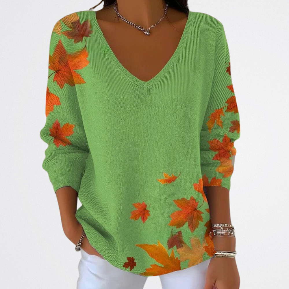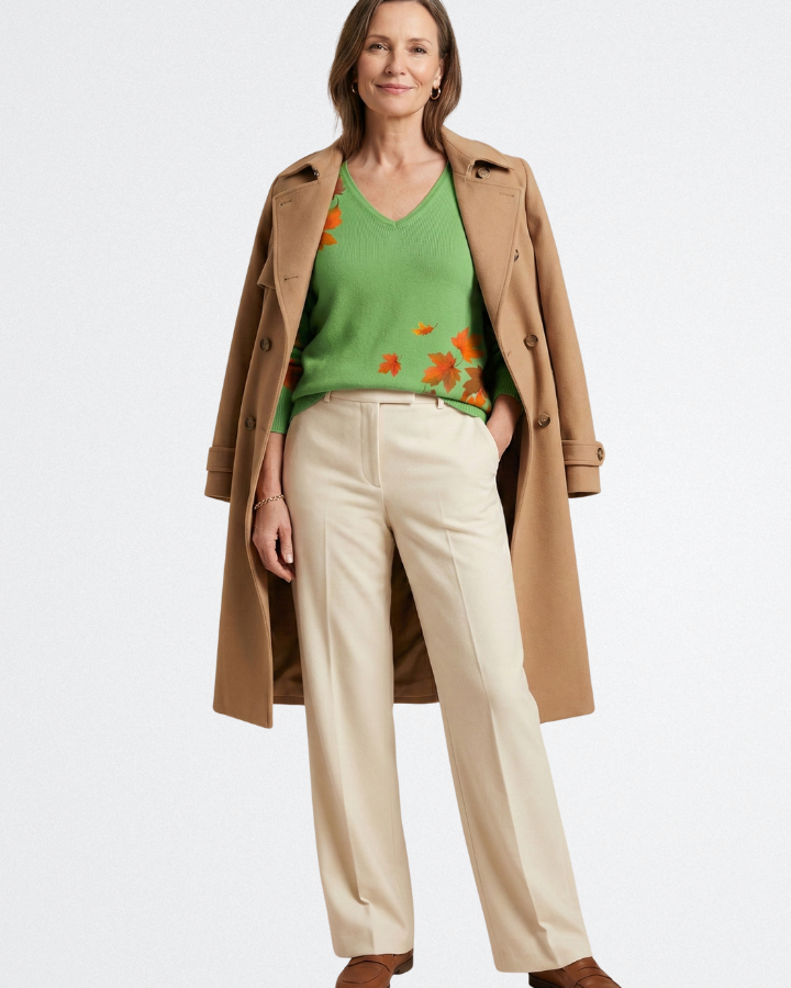 Ez a puha, kényelmes pulóver friss színt visz az őszi napokba. A meleg levélminta éppen annyi színt ad, hogy feldobja a hangulatod, miközben a laza szabás segít, hogy magabiztosnak és kényelmesnek érezd magad. Tökéletes választás hétvégi bevásárláshoz, családi vacsorákhoz vagy egy pihentető otthoni délutánhoz.