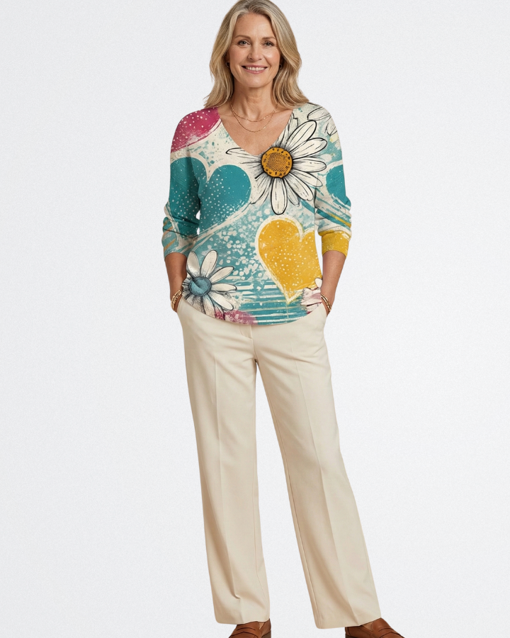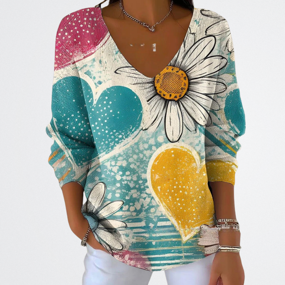 Ez a játékos, mégis nőies pulóver emlékeztet arra, milyen jó érzés újra mosolyogva öltözködni. A nagy szívek és kézzel rajzolt hatású margaréták vidámságot visznek a megjelenésedbe, miközben a kényelmes szabás segít, hogy magabiztos maradj – bármilyen napod is van. Tökéletes egy lazább munkanapra, bevásárlásra vagy egy délutáni kávé mellé.