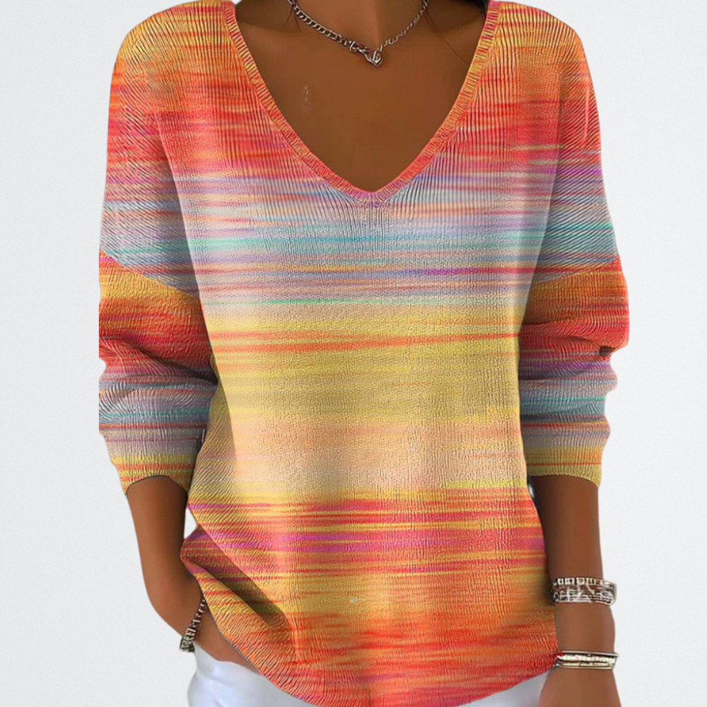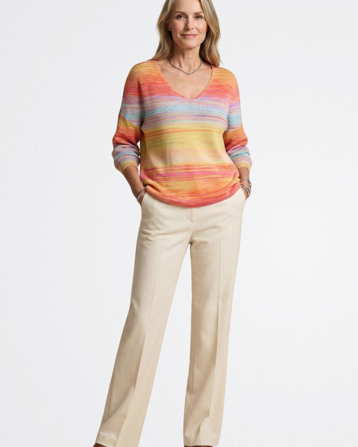 Ez a pulóver olyan, mint egy kis napsütés borús napokon. A színes csíkozás élénkíti a megjelenésed anélkül, hogy túl sok lenne, miközben a puha, laza szabás segít, hogy jól érezd magad a bőrödben. Tökéletes választás hétköznapokra, irodába, vagy amikor csak egy kis vidámságra vágysz az öltözködésedben.