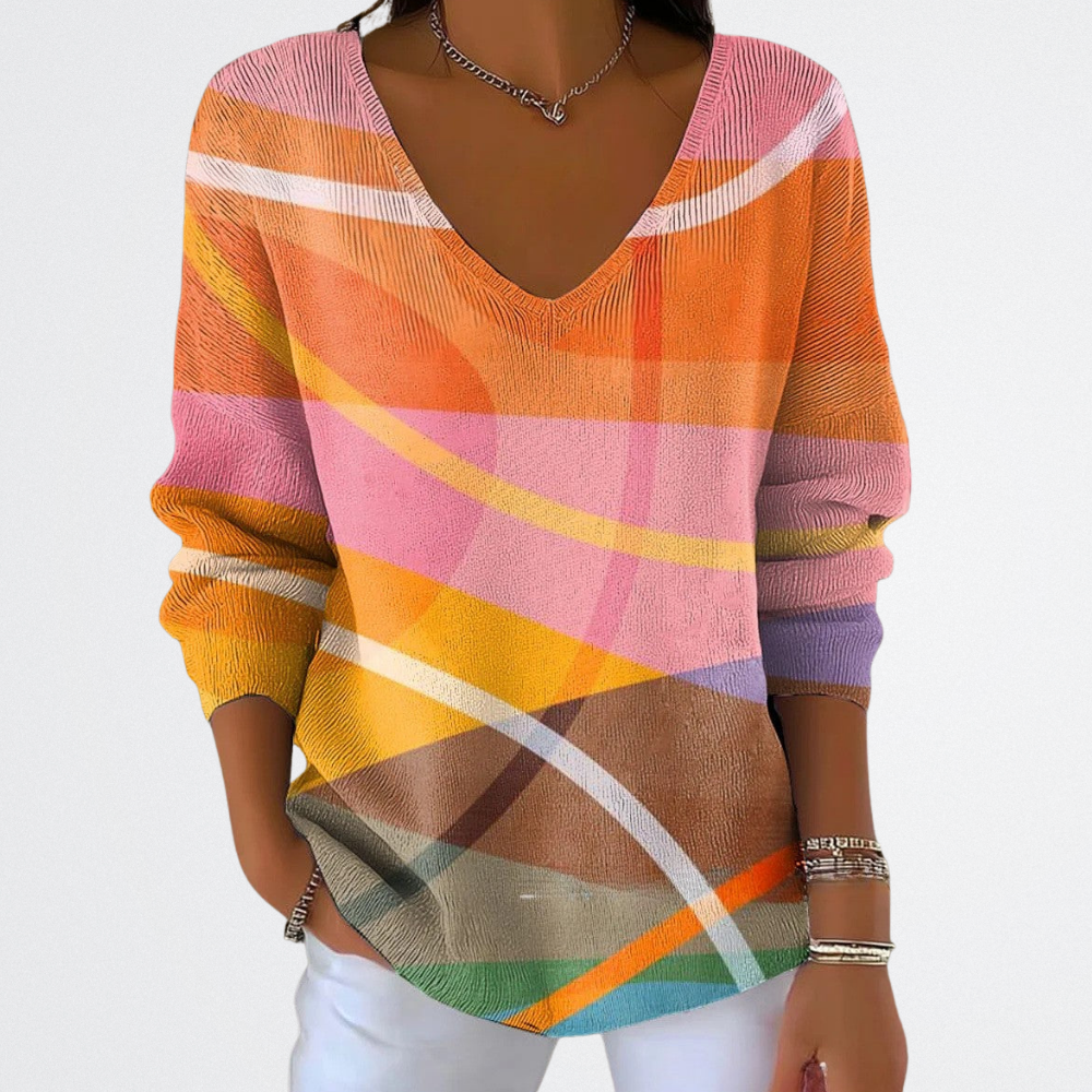 Ez a színes, lágy esésű pulóver újra életre kelti az öltözködés örömét. A modern, nőies minták feldobják a legegyszerűbb napokat is, miközben a V-nyak és a kényelmes szabás finoman kiemelik, amit szeretnél – és eltakarják, amit nem. Tökéletes munkanapokra, barátnős kávézásokhoz vagy csak egy kis önbizalomhoz a hétköznapokban.