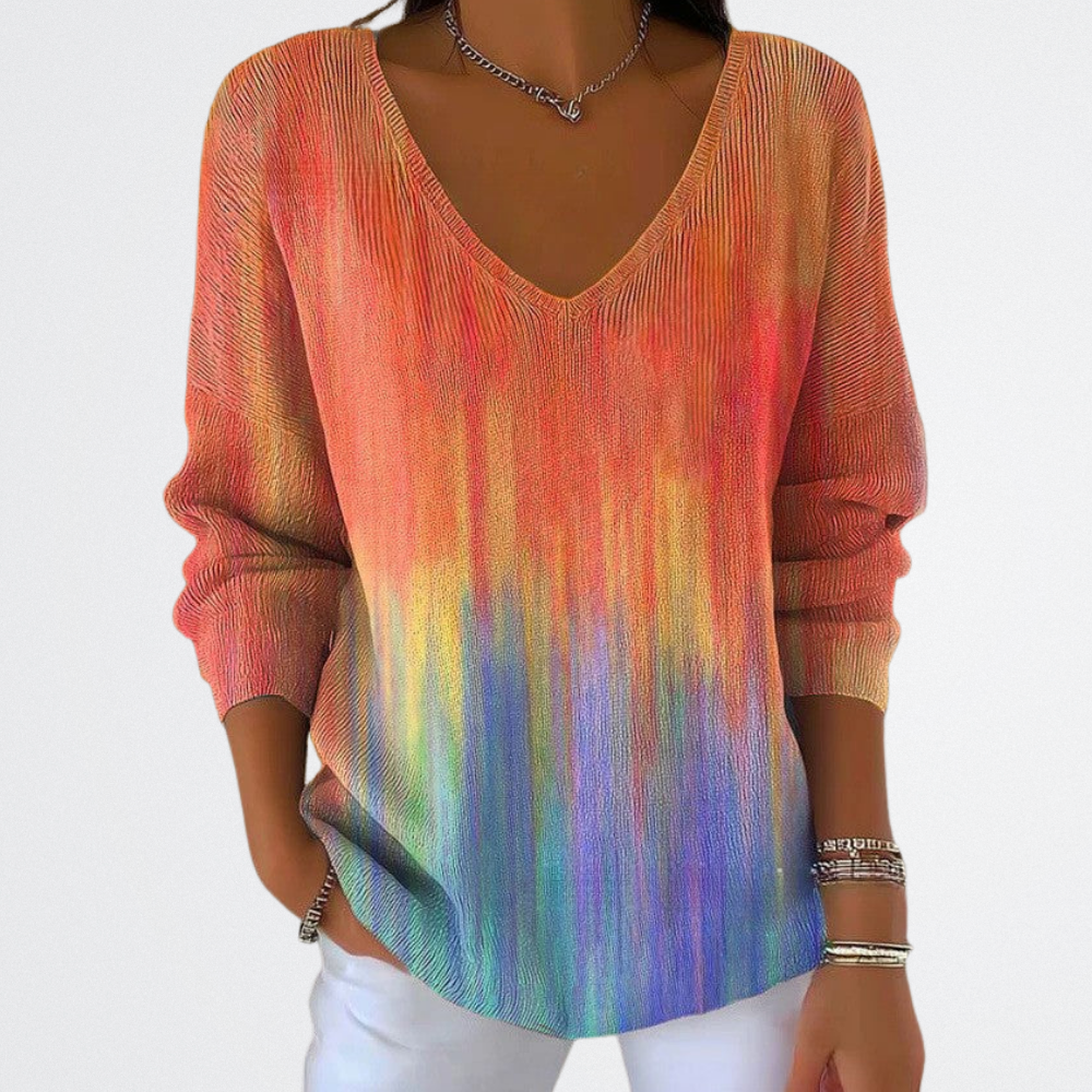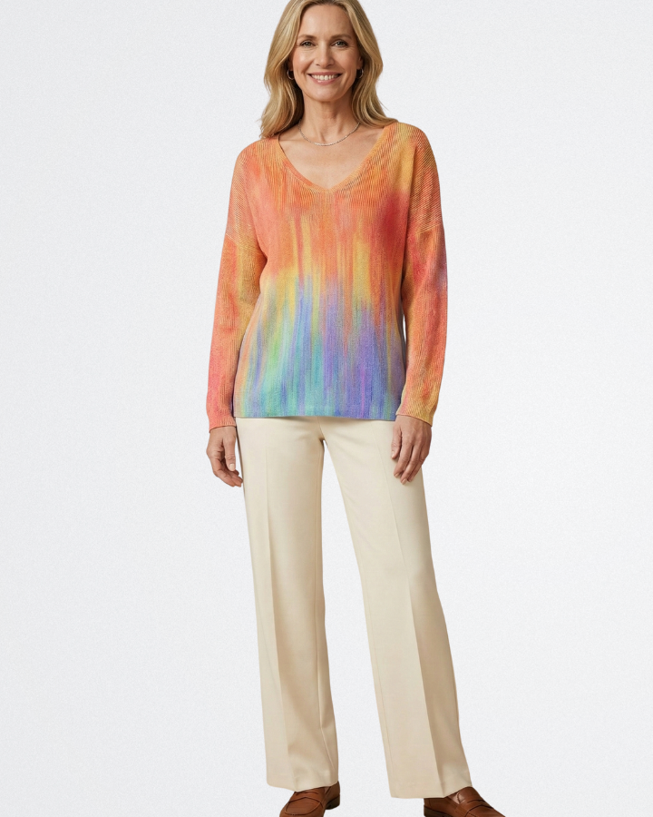 Ez a pulóver olyan, mintha egy festett naplementét viselnél magadon. A lágy színátmenet nőies, mégis modern megjelenést ad, miközben a kényelmes szabás segít, hogy ne kelljen aggódnod a problémás részek miatt. Tökéletes választás, ha valami különlegesre vágysz a hétköznapokban – legyen az munka, bevásárlás vagy egy barátnős program.
