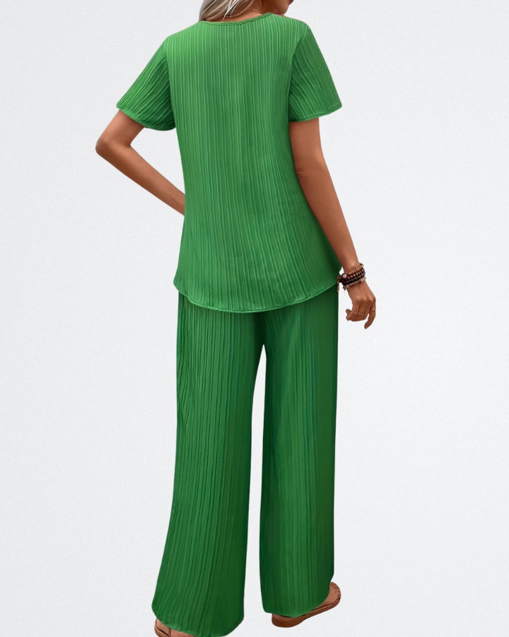 Ez a légies zöld szett azonnal könnyedén összeszereltnek érezheted magad. Tökéletes hétvégi brunchokhoz, családi összejövetelekhez vagy nyári napokhoz, amikor stílusosan szeretnél kinézni, de kényelmesen is akarsz maradni.