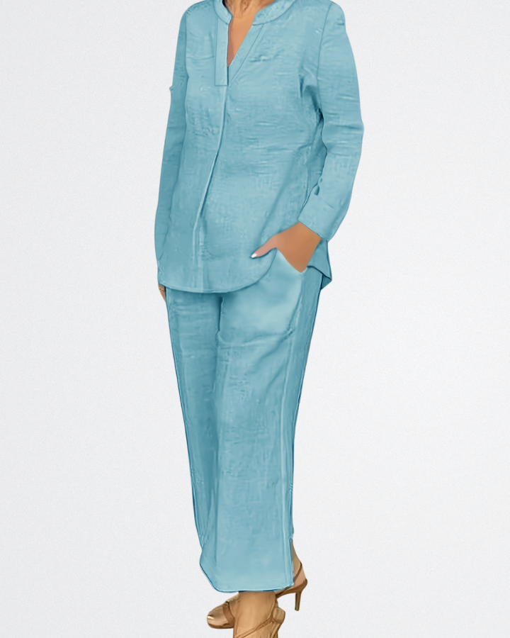 Ez a puha kék len szett elegánsnak érezteti magát anélkül, hogy túlöltözött lenne. Tökéletes nyári vásárlásokhoz, laza ebédekhez vagy meleg estékre, amikor magabiztosan szeretne megjelenni anélkül, hogy valami szűkbe kellene belepréselődnie.